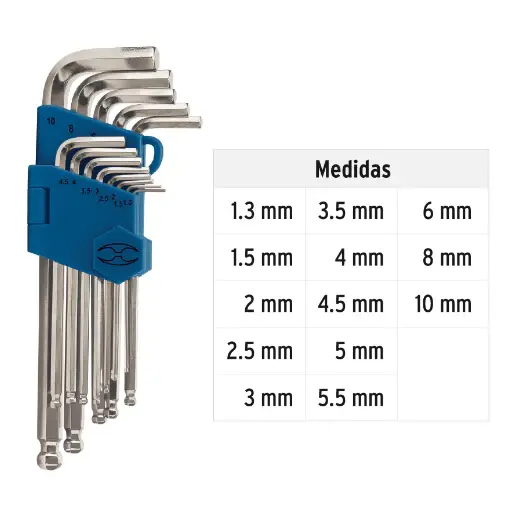 | Contenido | 13 llaves (1.3 mm, 1.5 mm, 2 mm, 2.5 mm, 3 mm, 3.5 mm, 4 mm, 4.5 mm, 5 mm, 5.5 mm, 6 mm, 8 mm y 10 mm) |