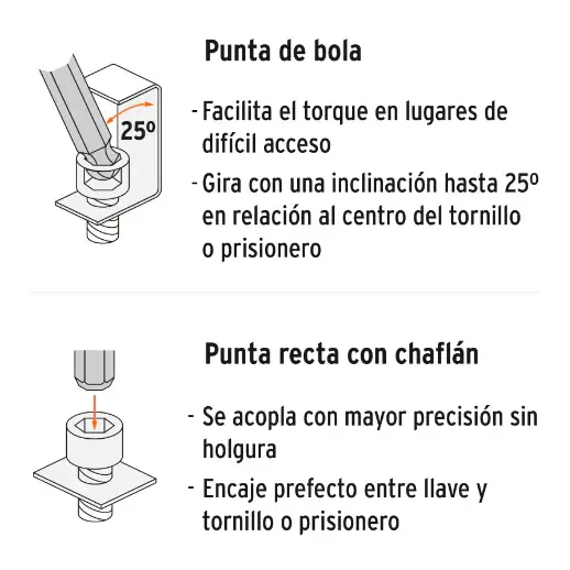 - Llaves largas de doble posición, que permiten mayor torque y alcanzar lugares de difícil acceso