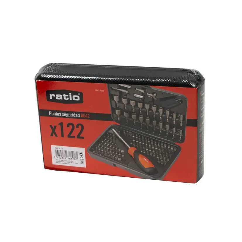 Este conjunto está formado por 122 accesorios de atornillado hechos enacero cromo-vanadio S2 y mango ergonómico antideslizante. El estuche es muy resistente, de material termoplástico opaco que incluye bisagra central y un cierre delantero.