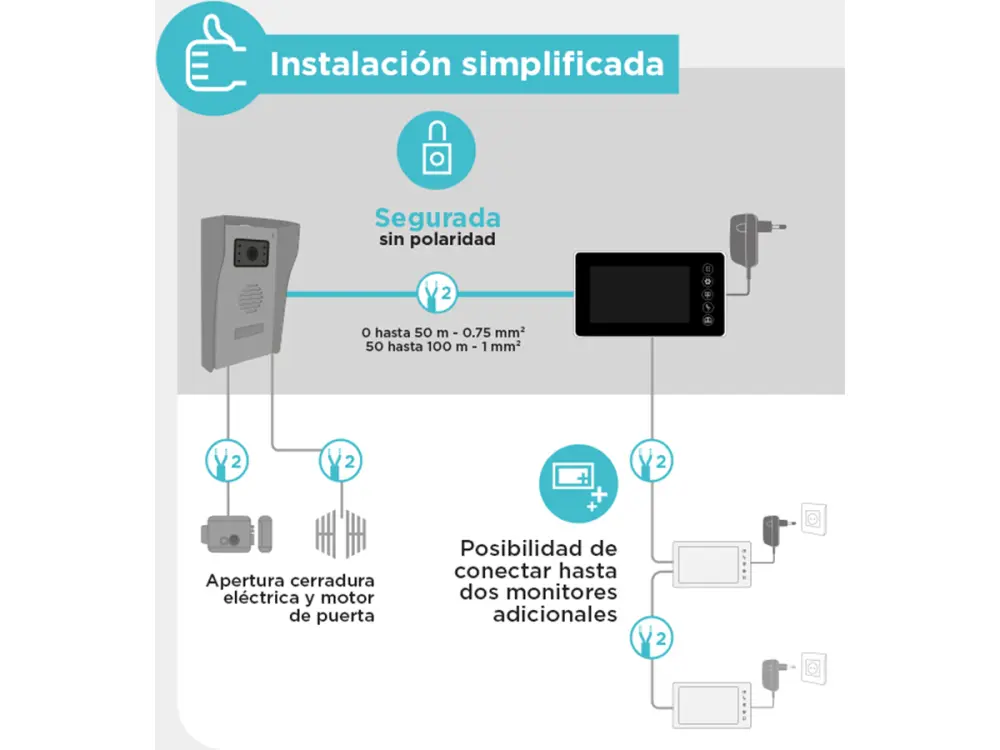 Este videoportero con cable es necesario para visualizar y responder a los visitantes desde tu casa. La placa exterior tiene las vantajas siguentes : visión nocturna, portaetiquetas retroiluminada, visera de protección, frente de aluminio, ángulo de visión 90°, tornillo antivándalo, índice de protección IP44. Por otra parte, el monitor de pantalla 4.3” – 11 cm tiene 5 melodías.Especificaciones
