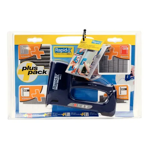 Incluye blíster promocional con grapas, clavos y pins para un uso inmediato.