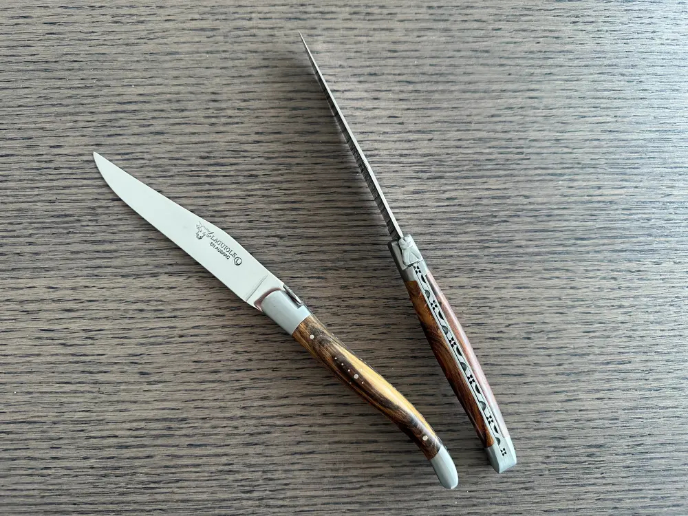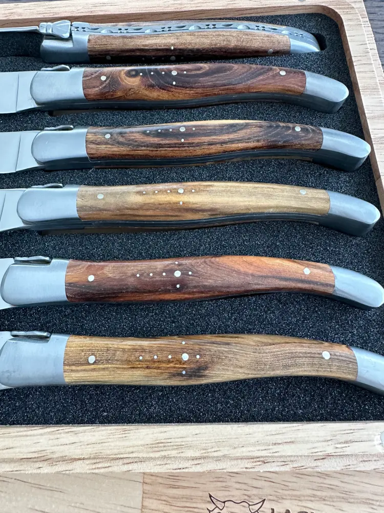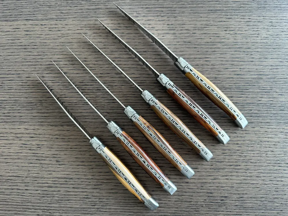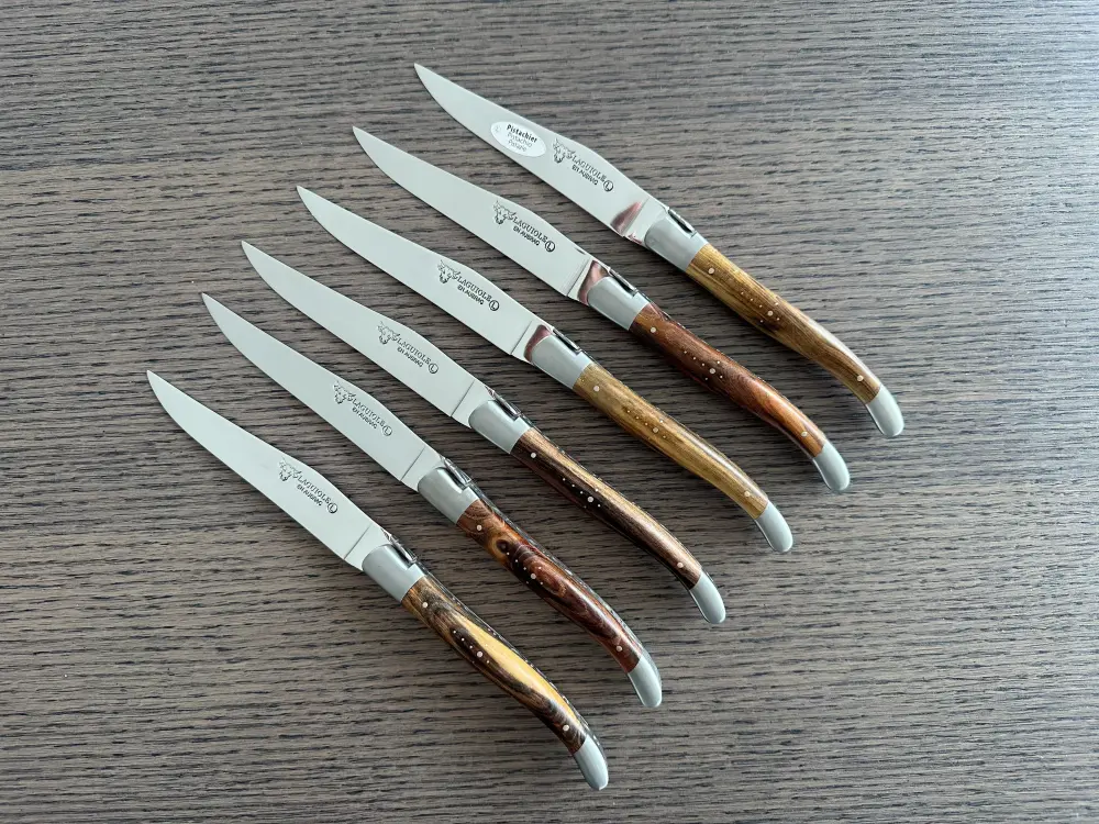 - Set of 6 heirloom-quality, handcrafted french steak knives with Pistachio Wood handles, shiny stainless steel blades, and matt finish stainless steel bolsters. Each displays the traditional «shepherd’s cross» on the handle.