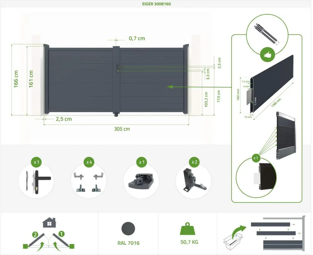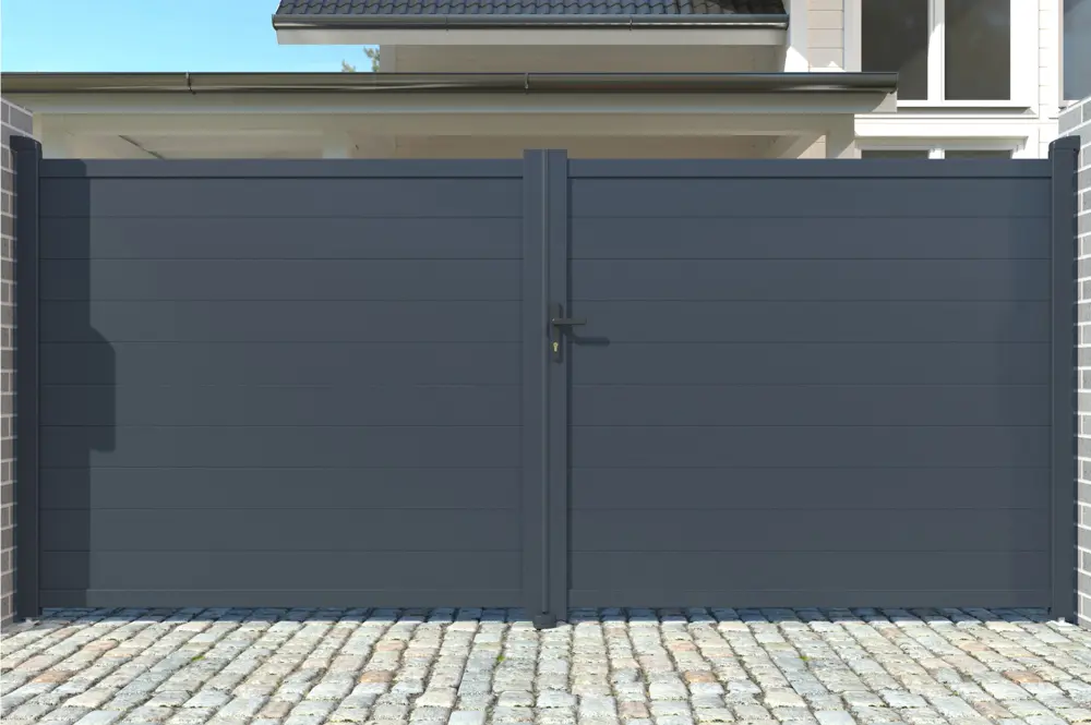 Puerta batiente de aluminio macizoanchura 300cm & altura 161cmcolor: gris anthracitaaccesorios incluidoscasanoov es especialista en puertas y portones en kit, para montar e instalar usted mismola puerta batiente eiger con su diseño fácil y moderno habilita una ocultación total para una mayor privacidad.descripción : puerta abatible recta de ocultación recta, 2 hojasmaterial : aluminiocolor : gris antracita (ral 7016)dimensiones : vasto 300 cm x alto 161 cmancho requerido entre pilares : 305 cmaltura mínima del pilar: 175 cminspirado y diseñado en franciaeste kit de puerta batiente para montar e instalar por ti mismo alberga :- 16 lamas con recubrimiento en polvo (altura 16 cm)- 2 lamas con recubrimiento en polvo reforzado para la motorización (altura 16 cm)- 2 bisagras superiores- 2 bisagras inferiores- 1 tope central- 2 topes final de carrera- 1 cerradura de cilindro – 1 manilla (color negro)- 5 llaves- tapas de acabado- tornillos y pernoslos postes no están incluidos en nuestros kits