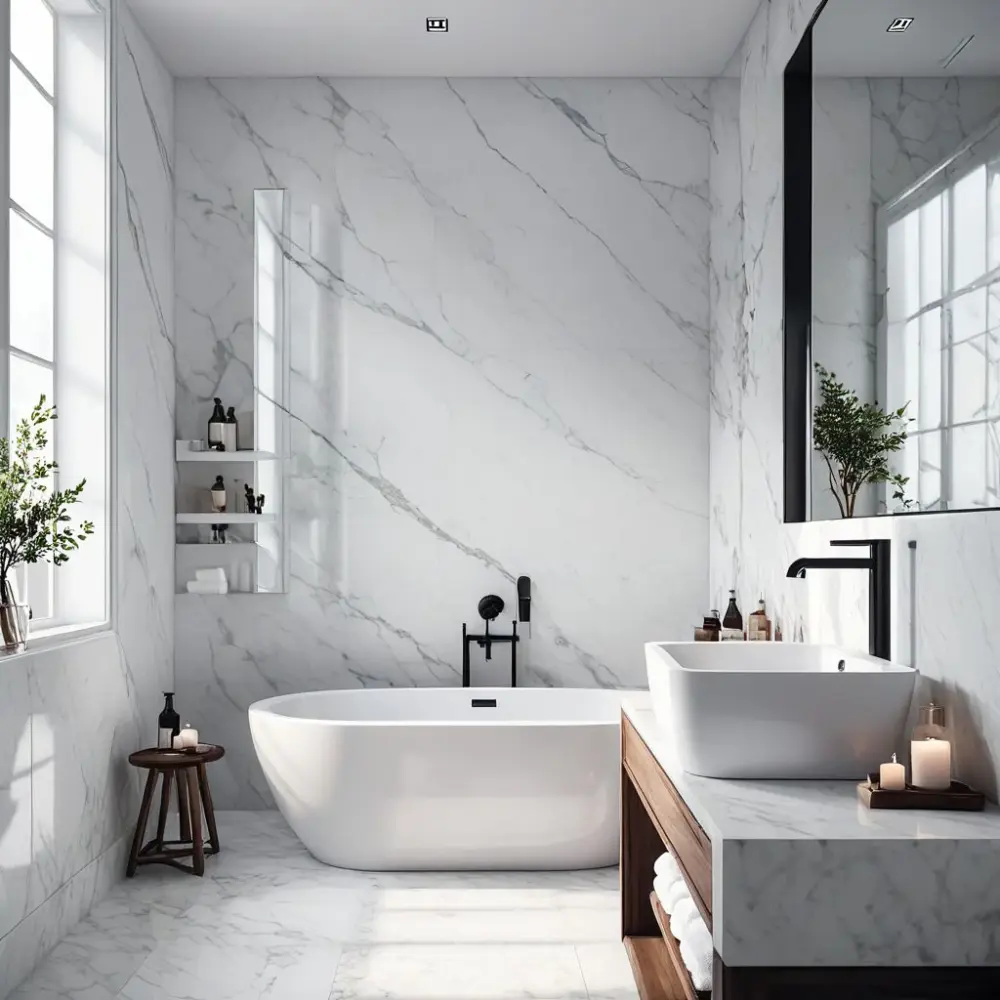 Son ideales para baños, cocinas, recibidores, muebles de TV, oficinas o prácticamente cualquier espacio de interior gracias a su formato de 122x244cm que hace que se vea y se sienta como una piedra natural.
