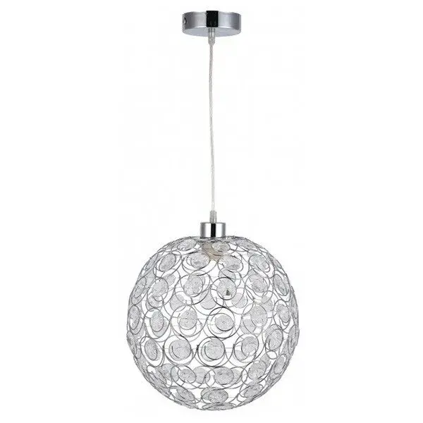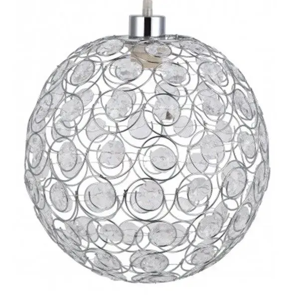 Lámpara de techo colgante, de uso interior, y con un llamativo diseño circular de 30 cm de diámetro, compuesto por pequeñas espirales engarzadas con una piedra de cristal en el centro, simulando una joya de diamante. El juego que la luz proyectará sobre esta enorme bola de cristal es lo que otorgará a esta lámpara un toque de distinción y elegancia ya que el vidrio permite como ningún otro material el paso de la luz y, gracias a las posibilidades de decoración que ofrece, te permitirá fabricar un ambiente diferente sin perder luminosidad.
