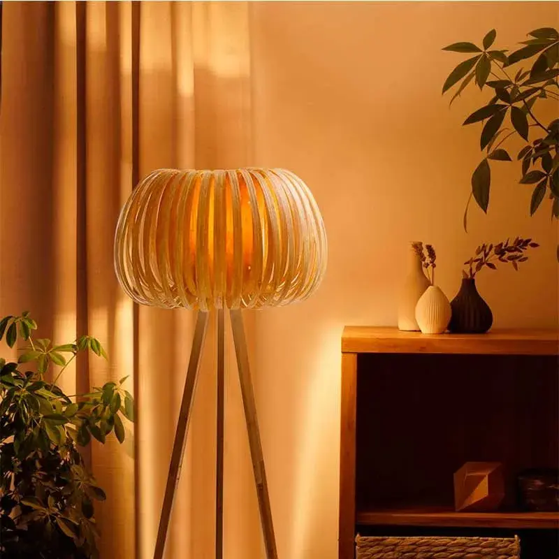 La lámpara de pie modelo Kusuma de la marca 7hSevenOn Deco es la elección ideal para fabricar un ambiente acogedor en cualquier estancia de tu hogar. Está fabricada con patas de bambú con acabado en color natural y pantalla de polipropileno de color crema. Gracias a su diseño natural llenará de frescura tu hogar combinando a la perfección con cualquier estilo decorativo. Enciende su cálida luz y relájate mientras lees un buen libro en tu cama o en tu salón. Esta lámpara se caracteriza por le diseño a tiras de su pantalla y requiere una bombilla con casquillo E14 (no incluida). Para limpiarla será tan intuitivo como pasar un paño húmedo por su superficie.