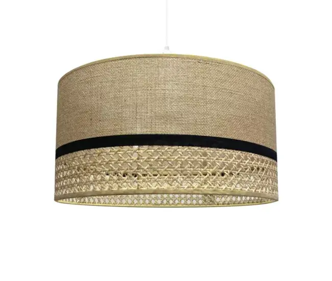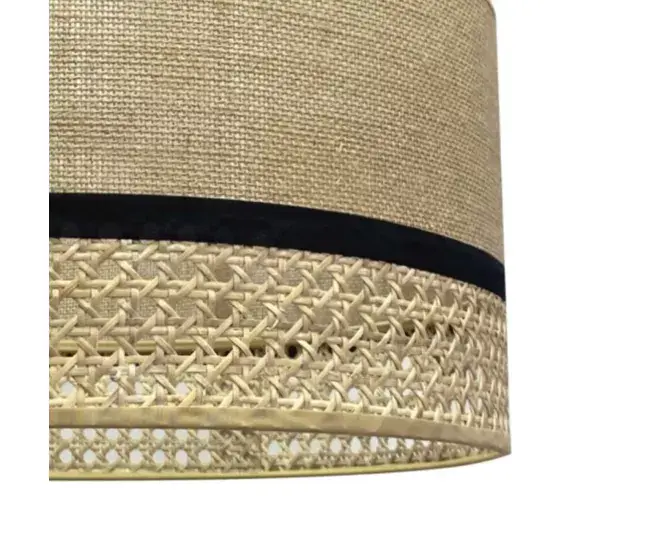 Lámpara colgante de saco rústico y rafia natural. Combinación de materiales y acabados para crear una decorativa lámpara de techo con pantalla cilíndrica. La parte superior de la pantalla es de saco rústico mientras que la parte inferior está realizada con rafia natural estilo cannage.Dimensiones: Largo 119,50 cm. Diámetro 40 cm.