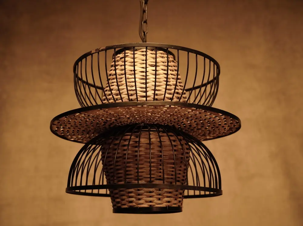 Lámpara de Techo Artesanal de Ratán y Acero – Estilo ✓ Formas geométricas que crean patrones de luz decorativos ✓ Perfil delgado que se integra discretamente en techos bajos ► Ilumina tu techo con estilo