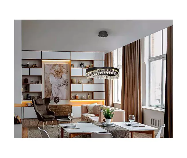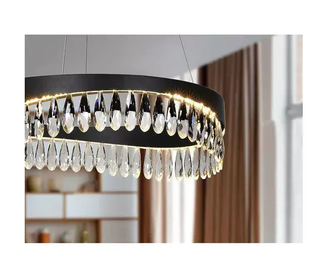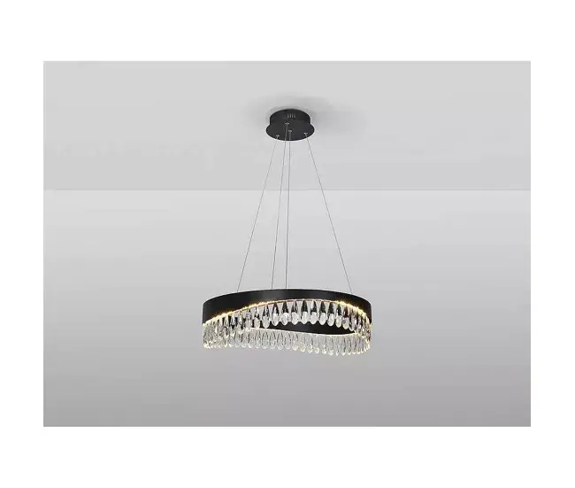 Le presentamos el artículo Lámpara COLGANTE SELENE. Esta lampara es de iluminacion led ,es comoda y practica muy decorativa , óptimo para un ambiente estilo moderno .Esta fabricada en metal y aluminio acabado negro mate , su portalámparas esta decorado con lagrimas de cristal acabado transparente.Idonea para tener iluminacion agradable, te aporta una luz tenue y confortable, la puedes ubicaren salon , comedor o en lugares como dormitorio o cocina, la puedes ubicar en cualquier rincon de tu hogar , ya que este tipo de lámparas ,son muy decorativas y funcionales.Las medidas de este modelo de este colgante sonde altura regulable de 60 -300cmcomo maximo de alto y 60 cm de diámetro. Su iluminación de LED tiene una potencia de 30w,con una temperatura de 3000k y 1300 lumenes.Material: Metal, cristalAcabado: Negro mate, facetadoDimensiones: 60,0 15,0 cmTiempo de montaje por el cliente: 25 minMedidas de la pantalla/tulipa: 60,0 16,0 cmFlorón (espacio para