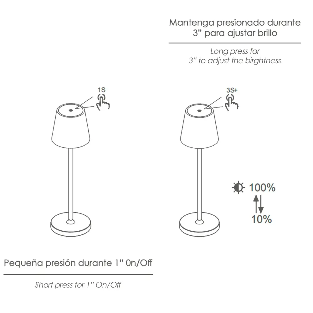 – Regulación de luz tactil, mediante pulsación prolongada en el boton de encendido.