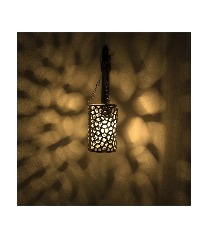 Lámpara de techo artesanal realizada en Marruecos, decorada con el calado típico árabe morisco, creando formas geométricas y florales. Emite una luz delicado y relajante, perfecta para iluminar entradas, pasillos o cualquier otro rincón de tu hogar, aportando un toque auténtico y elegante.