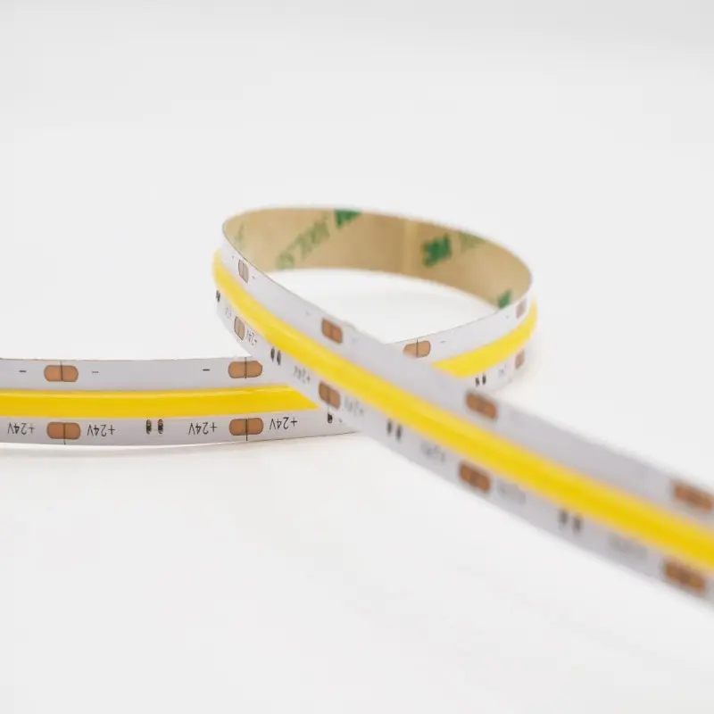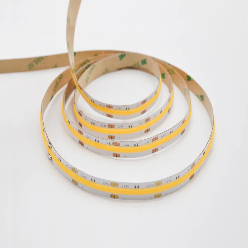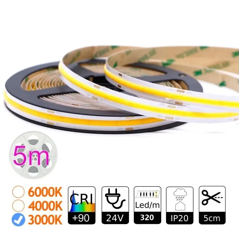La tira de led cob es una tira de iluminación led de alta densidad hecha con encapsulación cob. Respecto a las tiras tradicionales smd, los led cob mejoran en gran medida la vida útil del led; además la densidad de flujo de luz es alta, el deslumbramiento es menor, la luz es uniforme y no hay zonas oscuras.El corte de la tira se puede ejecutar cada 5 cm. Requiere una fuente de alimentación para su funcionamiento.incluye una banda adhesiva para simplificar su instalación sobre cualquier superficie.La tira led 24v interior, tiene un color de luz blanco cálido. En concreto 3000k (grados kelvin). El blanco 3000k es el color blanco con más tendencia al amarillo. Es el mas adecuado para dar un tipo de iluminación decorativa y cómoda a la vista para lugares de estar confortables.La calidad de la luz tiene un ra o cri de 90. Lo que nos garantiza una gran fidelidad de los colores de los objetos ,prendas, espacio, etc… Iluminados por esta tira led.Especificaciones