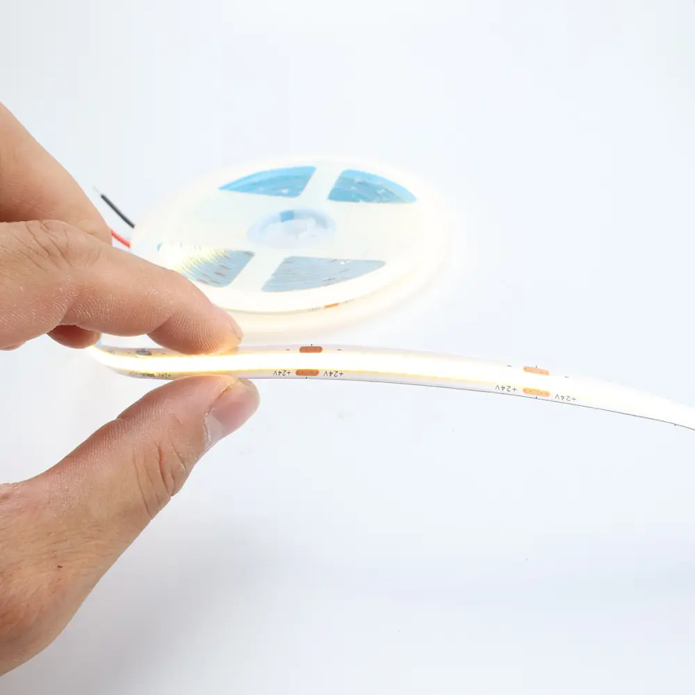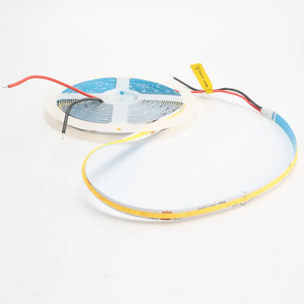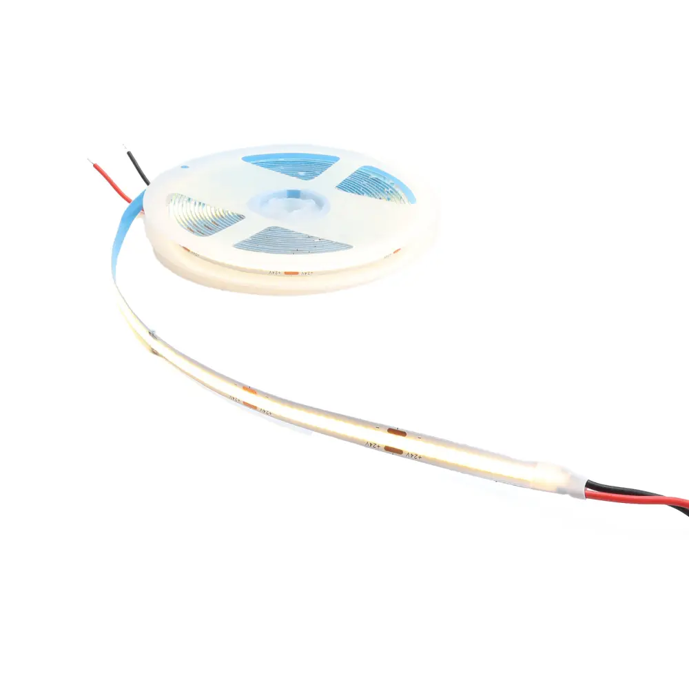 La tira LED COB 24V DC sobresale por su iluminación luminoso y uniforme, sin sombras ni puntos de luz visibles, gracias a su tecnología COB que ofrece una densidad de 320 chips/metro. Su diseño delgado de 8mm y gran flexibilidad permiten una instalación sencilla en cualquier espacio, con cortes cada 4cm y autoadhesivo 3M para una fijación segura.Esta tira regulable está disponible en blanco cálido (2700K), blanco neutro (4000K) y blanco fresco (6000K), ofreciendo una intensidad lumínica de 10W por metro, superior a las tiras LED convencionales. Presentada en un rollo de 5 metros, es ideal para hogares, oficinas o comercios, con un ancho de 8mm que facilita su instalación en cualquier rincón.Atributos principales:Potencia nominal: 24V DCEficiencia: 90lm/WPotencia: 10W/mÁngulo de apertura: 120°DimmableAncho: 8mmDistancia de corte: 40mmIP20: uso interiorLongitud tira: 5 metrosChips LED: COB (320chips/m)Reabastecido en tonalidades: blanco cálido (2700K), blanco neutro (4000K) y blanco frío
