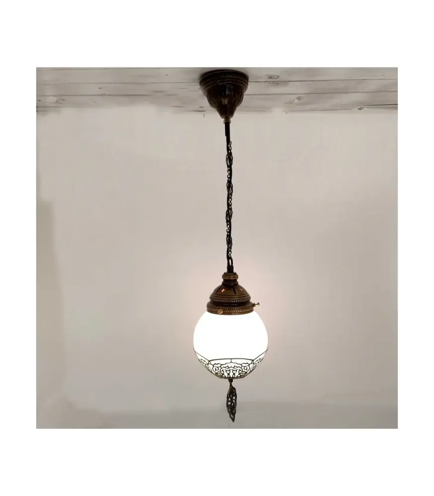 Lampara fabricada en Turquía en acero cortado por láser y cristal craquelada en color blanco mate. Autentica lampara otomana.