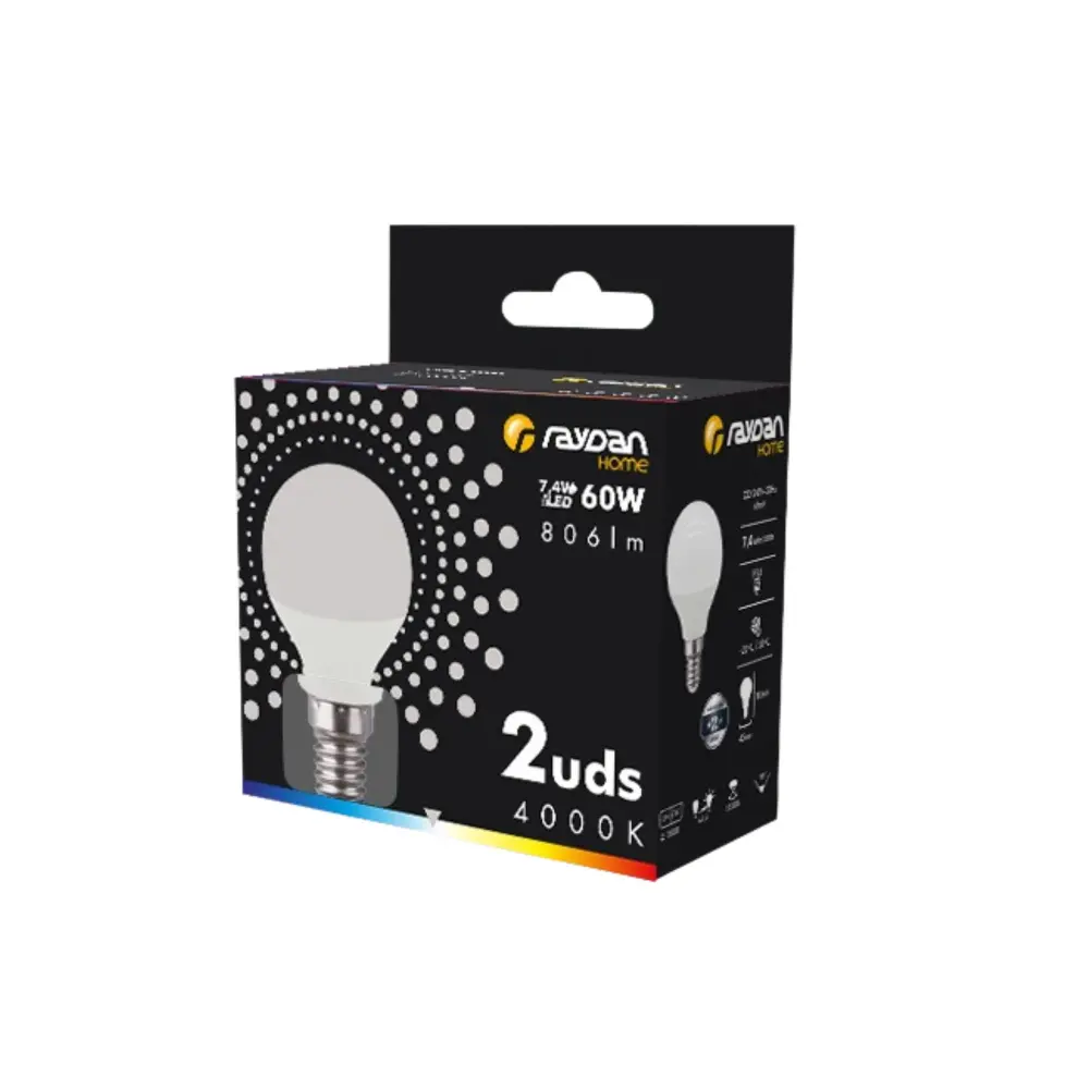 Pack 2 bombillas LED E14 esférica 7.4W de Raydan Home, máxima iluminación para espacios interiores como salones, comedores, recibidores, dormitorios o cocinas. Perfectas para lámparas de techo, pie o sobremesa.
