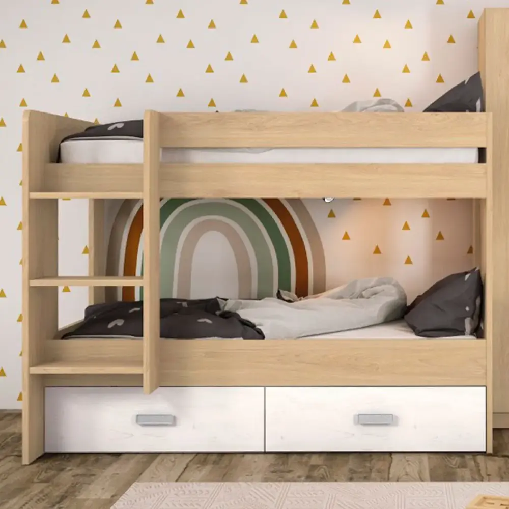 La litera con cajones Donald es la elección perfecta para mejoraral máximo el espacio en dormitorios infantiles y juveniles. Fabricada con melaminade alta calidad, esta litera destaca por su diseño moderno y su granversatilidad. Compuesta por 2 camas, 1 escalera y 2 cajones inferiores, lalitera Donald es ideal para dormitorios donde duermen 2 niños/as o para tenerespacio disponible para que tu hijo/a pueda convocar a sus amigos a dormir. Laescalera, situada en el lateral, facilita el acceso a la cama superior de formasegura y sencilla. Los 2 cajones incorporados ofrecen espacio adicional dealmacenamiento para guardar ropa de cama, juguetes u otros objetos, manteniendoel dormitorio organizado y limpio. Es se adapta a con colchones de tamañoestándar de 90×190 cm. Su superficie l