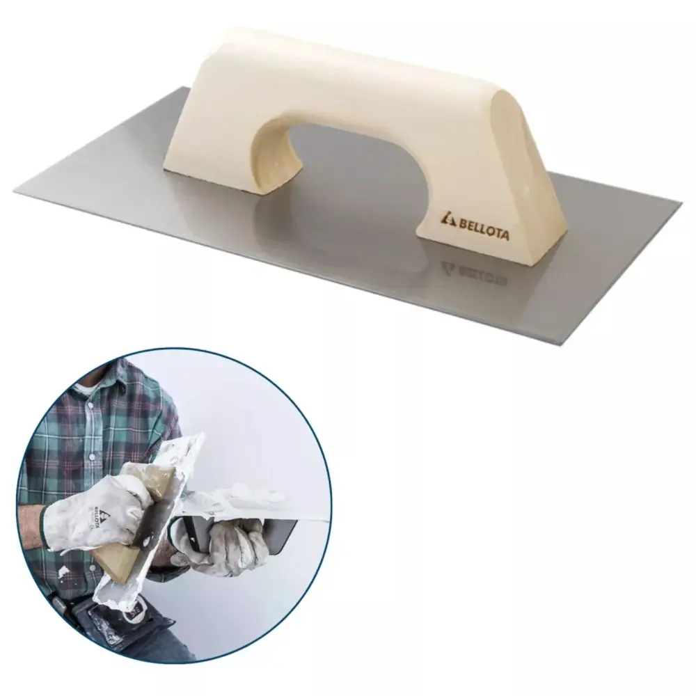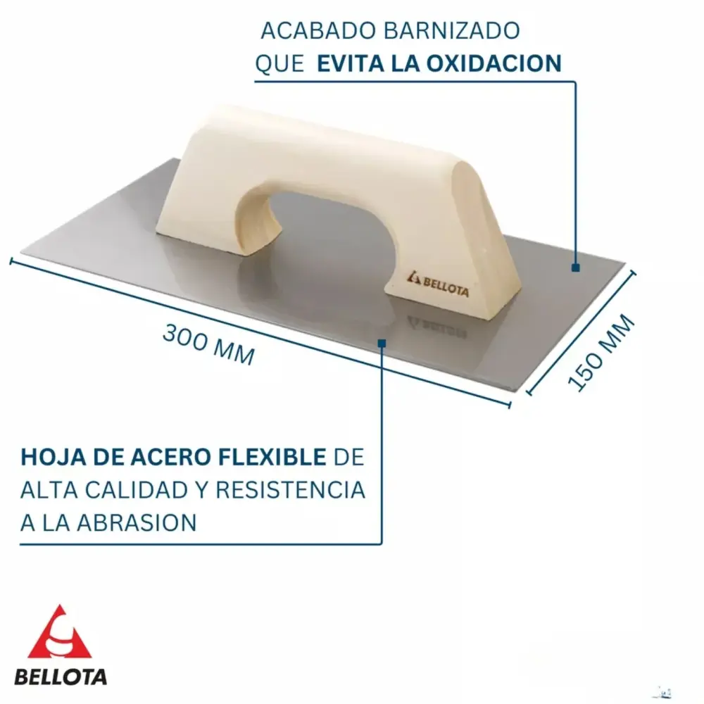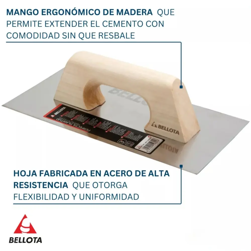 • MARCA: BELLOTA® • MATERIAL: HOJA FABRICADA EN ACERO RESISTENTE A LA ABRAZION Y MANGO DE MADERA • ANCHO DE LA HOJA: 180 MM • ESPESOR DE LA HOJA: 0.75 MM • HOJA CON UNA EXTRAORDINARIA FLEXIBILIDAD Y PLANITUD • MANGO LIGERO DE MADERA PARA QUE PUEDAS AMPLIFICADOR Y ALISAR EL CEMENTO O EL YESO CON COMODIDAD • HUECO DE LA MANO ADAPTADO PARA ZURDOS Y DIESTROS • REALIZA TRABAJOS DE ACABADO, EXTIENDE Y ALISA CEMENTO, MORTERO, YESO Y OTROS MATERIALES