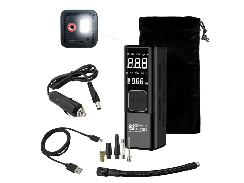 Der KS P20 Auto-Kompressor mit Powerbank-Funktion von Könner & Söhnen® erweist sich als zuverlässiges Hilfsmittel zum Aufpumpen verschiedenster Reifentypen, darunter Reifen für Auto- und Motorradtechnik, Fahrräder, Kinderwagen sowie Garten- und Baukarren. Zudem ist er für Besitzer von Sportausrüstung nützlich, da er sich zum Aufblasen von Bällen, Luftmatratzen, Schwimmspielzeug, Schwimmwesten und anderen aufblasbaren Produkten eignet. Dank des eingebauten Akkus ist keine Anbindung an eine externe Stromquelle wie ein Stromnetz oder einen Autoakku notwendig. Der Aufblasvorgang ist schnell und effizient, wobei der KS P20 Kompressor eine beeindruckende Aufblasgeschwindigkeit von 23 Litern pro Minute erreicht.