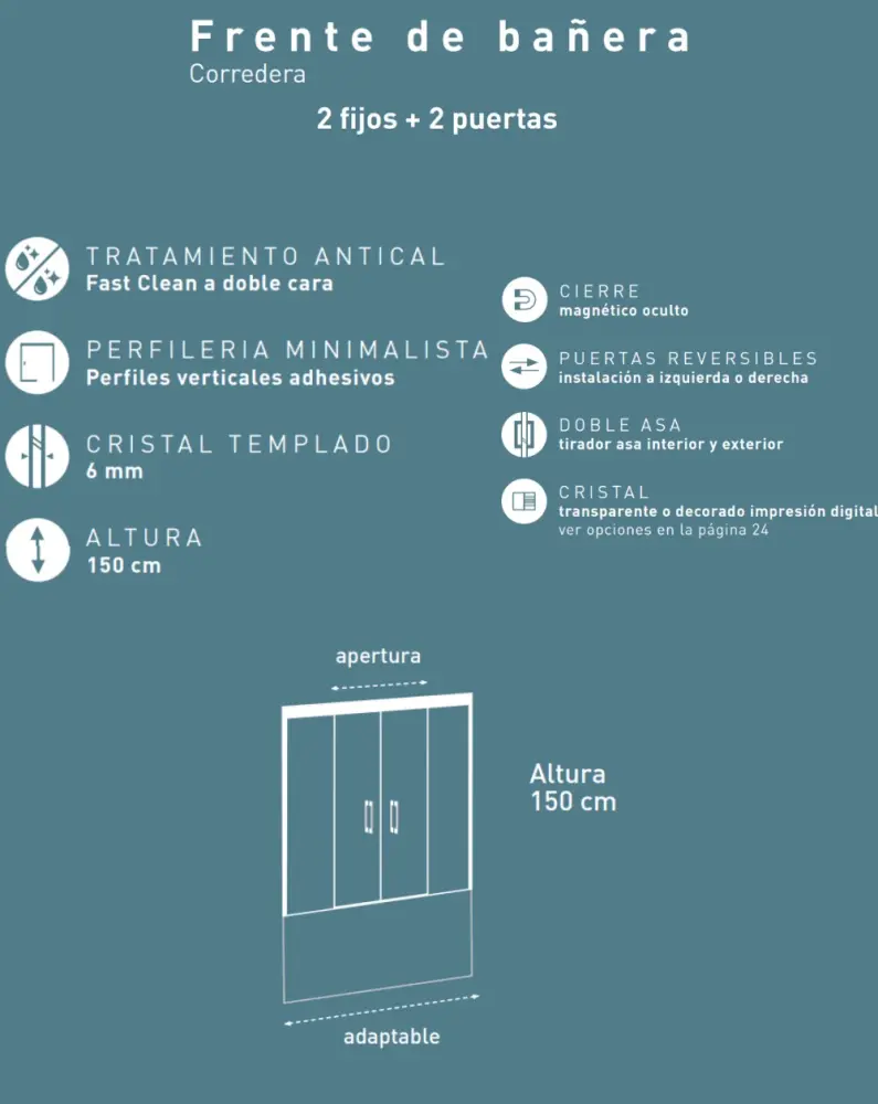 Mampara Bañera Frontal Corredera | Vidrio templado de 6mm con ANTICAL | Frente de Bañera de 2 Fijos + 2 Puertas Correderas Apertura Central con Cierre Magnético |Altura 150cm.