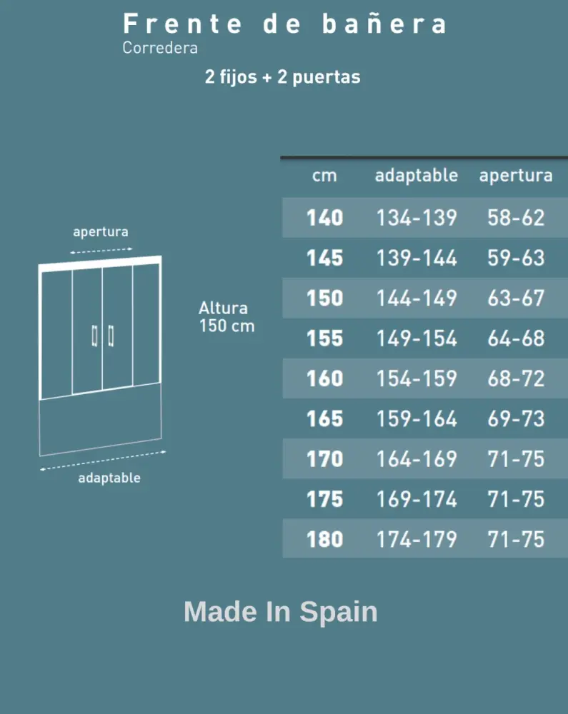– Mampara de bañera frontal compuesto por 2 fijo + 2 puerta corredera con apertura central. Vidrio templado de 6mm con tratamiento antical a doble cara. Altura de 150cm. Reabastecido en una gran variedad de medidas, desde los 140cm hasta los 180cm de ancho. Mampara de bañera de diseño para aquello que buscan un acceso cómodo.