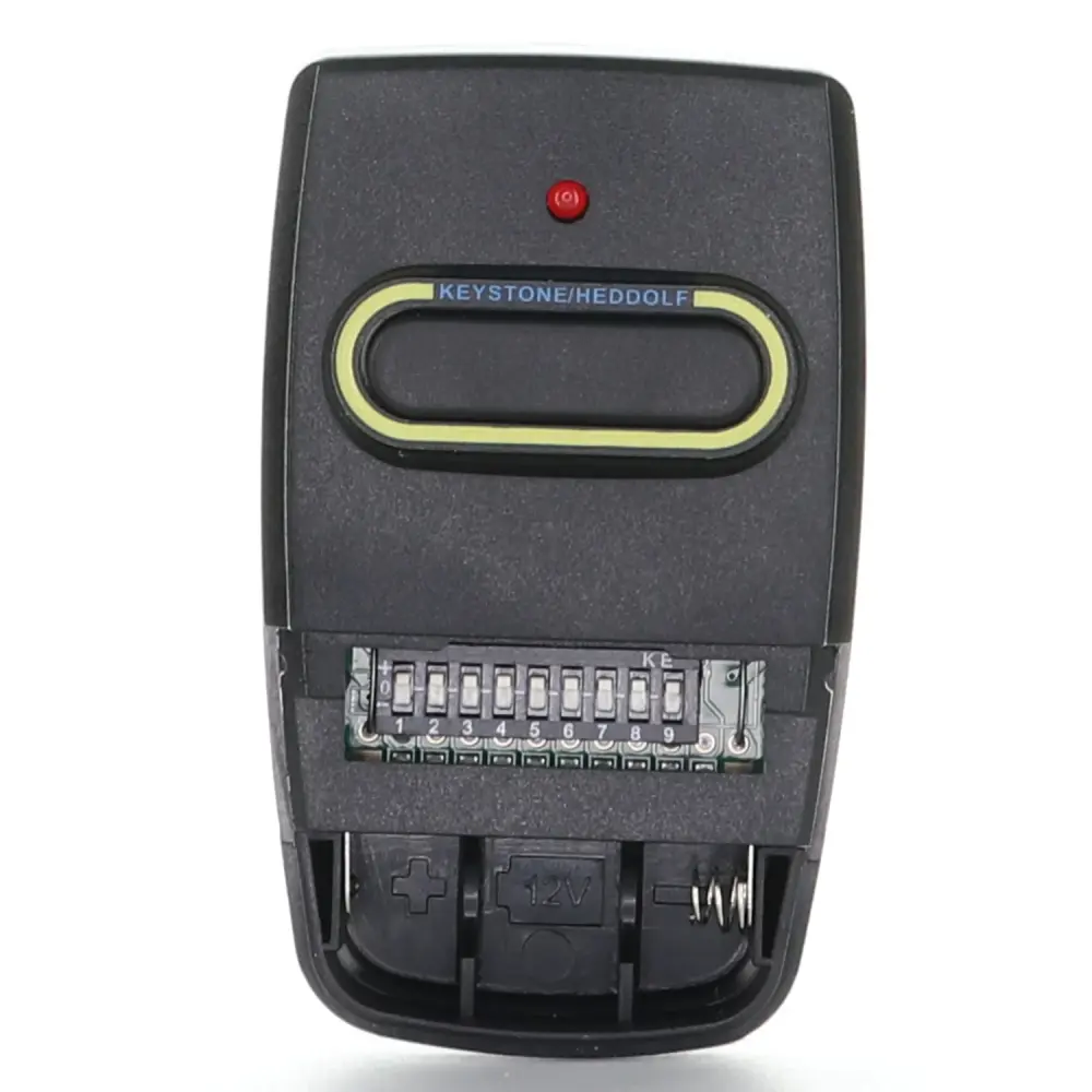 Transmisor remoto Heddolf 0220-360 para abre-puertas de garaje o portones con tamaño de visera. Códigos que utilizan 9 interruptores DIP con 3 posiciones cada uno (+/0/-). Funciona con con abre-puertas de garaje marca Over Head Door, Crusader y Heddolf. Frecuencia de 360 Mhz, clip para visera y batería incluidos.