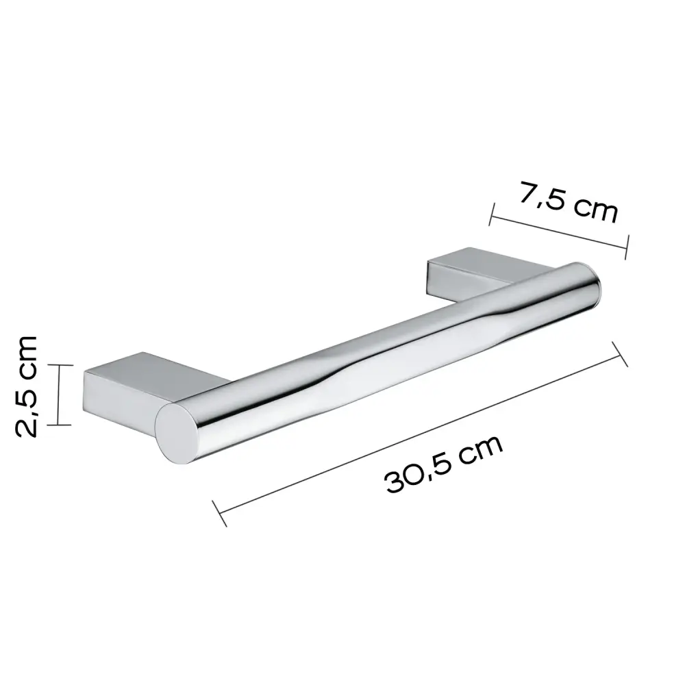 El Maniglione de seguridad de 30 cm de la serie Canarie de Gedy une seguridad y estilo en el baño. Realizado con latón y Cromall de alta calidad, su acabado cromado brillante realza superficies modernas y añade un toque de sofisticación al ambiente. El perfil cilíndrico, sostenido por dos bases de contacto plano, ofrece un agarre cómodo y una solidez fiable, pensado para durar en el tiempo en ambientes húmedos y sujetos a uso diario.