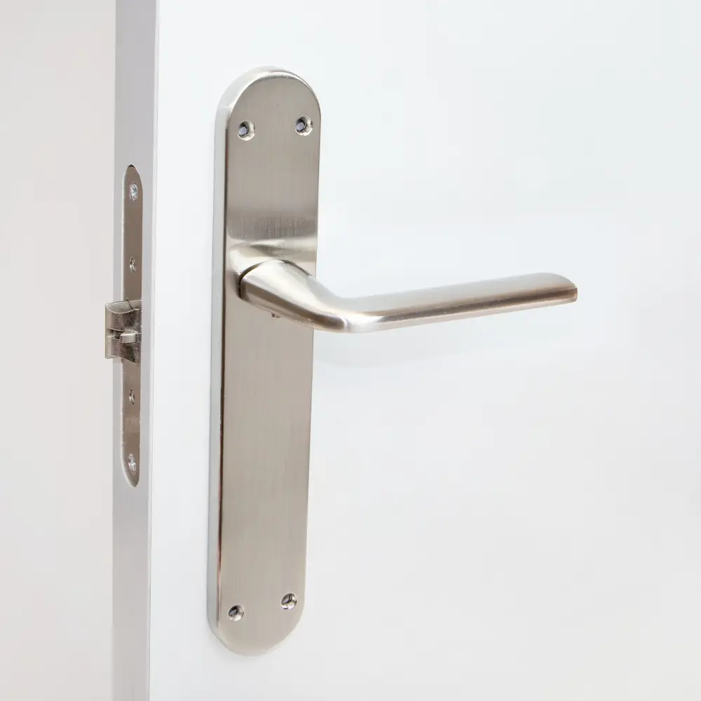 Uso juegos de manillas para puerta de interior de espesor entre 35mm y 45mm.Diseño de líneas modernas y sencillas.Con muelle de rectorno para devolver la manivela a su posición horizontal.Fabricadas en aluminio y zamak con acabado níquel satinado.El kit incluye: 1 juego de manillas con placa, cuadradillo y herrajes de montaje.Especificaciones