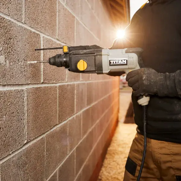 Este martillo perforador giratorio 4 en 1 Titan está equipado con taladro giratorio apto para madera o metal, taladro giratorio con percutor para perforar en hormigón y martillo para trabajos de cincelado en hormigón.