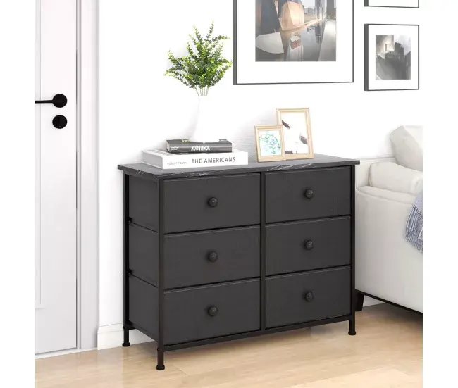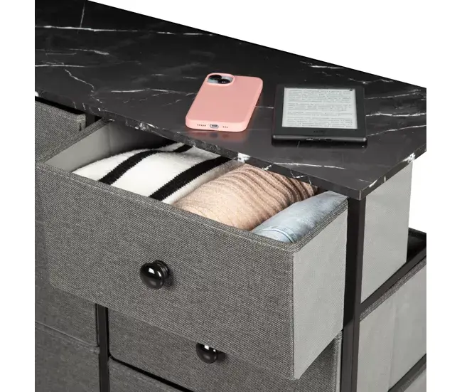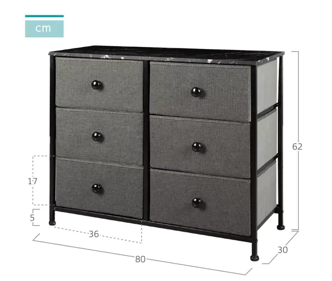 ¿Buscas un mueble de almacenaje que, además de cumplir su función, añada un toque sofisticado y moderno a tu hogar? Esta cómoda es para ti. Está diseñada en un elegante color negro y gris oscuro y cuenta con 9 amplios cajones para brindarte el espacio perfecto para guardar una variedad de artículos y ayudarte a mantener todo organizado y accesible. Gracias a su diseño neutro es una cómoda perfecta para cualquier habitación de la casa, desde el dormitorio, vestidor o recibidor hasta el salón. Está fabricada con estructura de acero, tablero MDF con efecto mármol y cajones de tejido no tejido plegables. Destaca por el sistema de nivelación en las patas, que permite regular ligeramente su altura para una colocación perfecta y firme en cualquier tipo de suelo, evitando tambaleos. Su montaje es sencillo y rápido gracias a las instrucciones y a los cajones de tela plegables, que se colocan sin esfuerzo sobre la estructura una vez montada. En defini