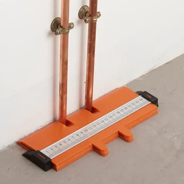Accesible, simplemente presione los dientes del calibre contra la forma irregular y luego cópielo en el suelo para hacer un corte preciso.