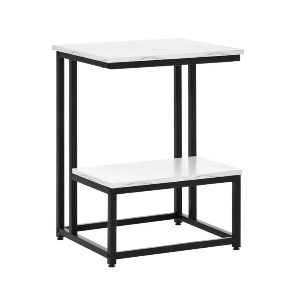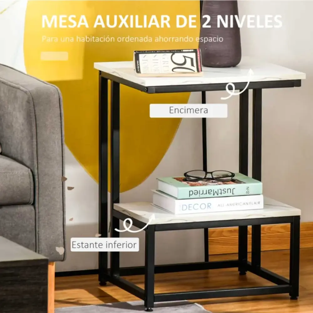 Si lo que estásbuscando es una mesa auxiliar moderna y minimalista, no busques más porque lahas encontrado. Esta mesa auxiliar de Homcom cuenta con una estructura metálicamuy resistente y duradera, y una superficie laminada con acabado texturizadosímil al mármol que le aporta ese toque distinguido. Cuenta con una capacidad decarga de 10kg de peso, por lo que podrás dejar tus libros, revistas, decoracióny todo lo que necesites en sus 2 niveles. Sus pies son ajustables, de maneraque se ajustará a cualquier tipo de suelo, incluso irregulares o mal nivelados.Además, son antideslizantes, lo que le aportan una gran estabilidad a la mesa.Gracias a su diseño compacto, es perfecta para el salón, comedor, dormitorio,pasillo… ¡donde quieras! ¡No lo dudes más y aprovecha al máximo el espacio a unprecio bestial!