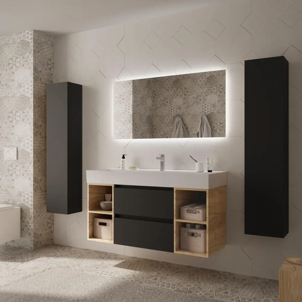 Formado por mueble de 2 cajones Negro mate de 60 cm + 2 coquetas a ambos lados del mueble de cajones de 2 huecos Roble de 30 cm cada una + Lavabo integrado.