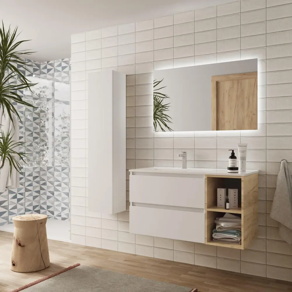 Mueble baño bequia plus blanco con coqueta derecha con lavabo ★ Perfecto para disfrutar de un baño relajante con tus cosas a mano ★ Mantiene tus toallas y albornoces secos y fuera del alcance del agua → Relájate con tu bebida favorita