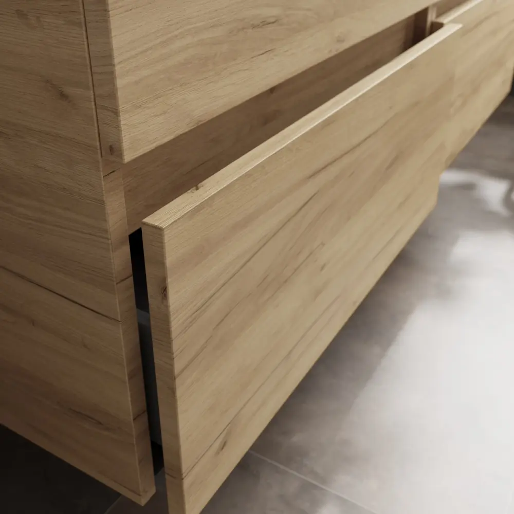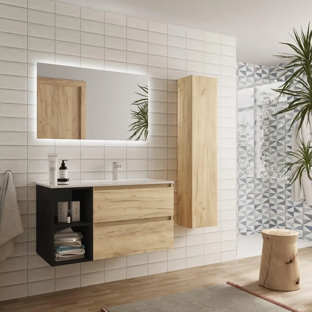 Formado por mueble de 2 cajones Roble de 60 cm + coqueta izquierda de 2 huecos Negro mate de 30 cm + Lavabo integrado.