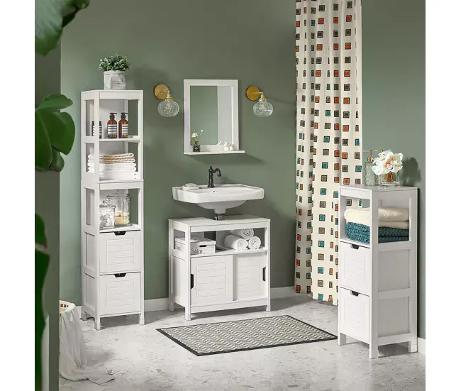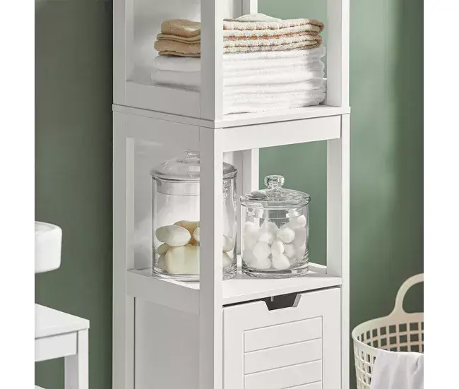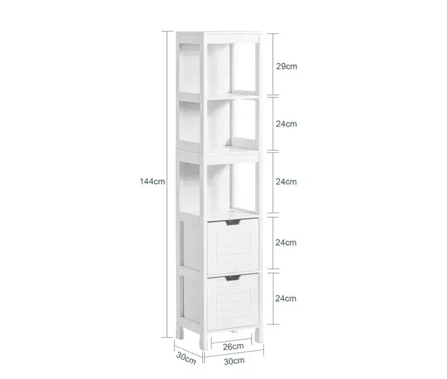Material: Madera lacada en blanco MDF. La superficie de lacado de los muebles sub-cuenca resistente a la humedad.Dimensiones: L30cm x H144cm x P30cm. Capacidad máx. 10 kg / estante. Peso: 16.4 kg.Esteras antideslizantes para estabilidad garantizada. Columna de muebles de Baño con 3 estantes y 2 cajones.Ofrece un espacio lo suficientemente abultado como para guardar sus accesorios diarios en el cuarto de Baño. Ideal para optimizar el almacenamiento en su inodoro.MaterialMDF