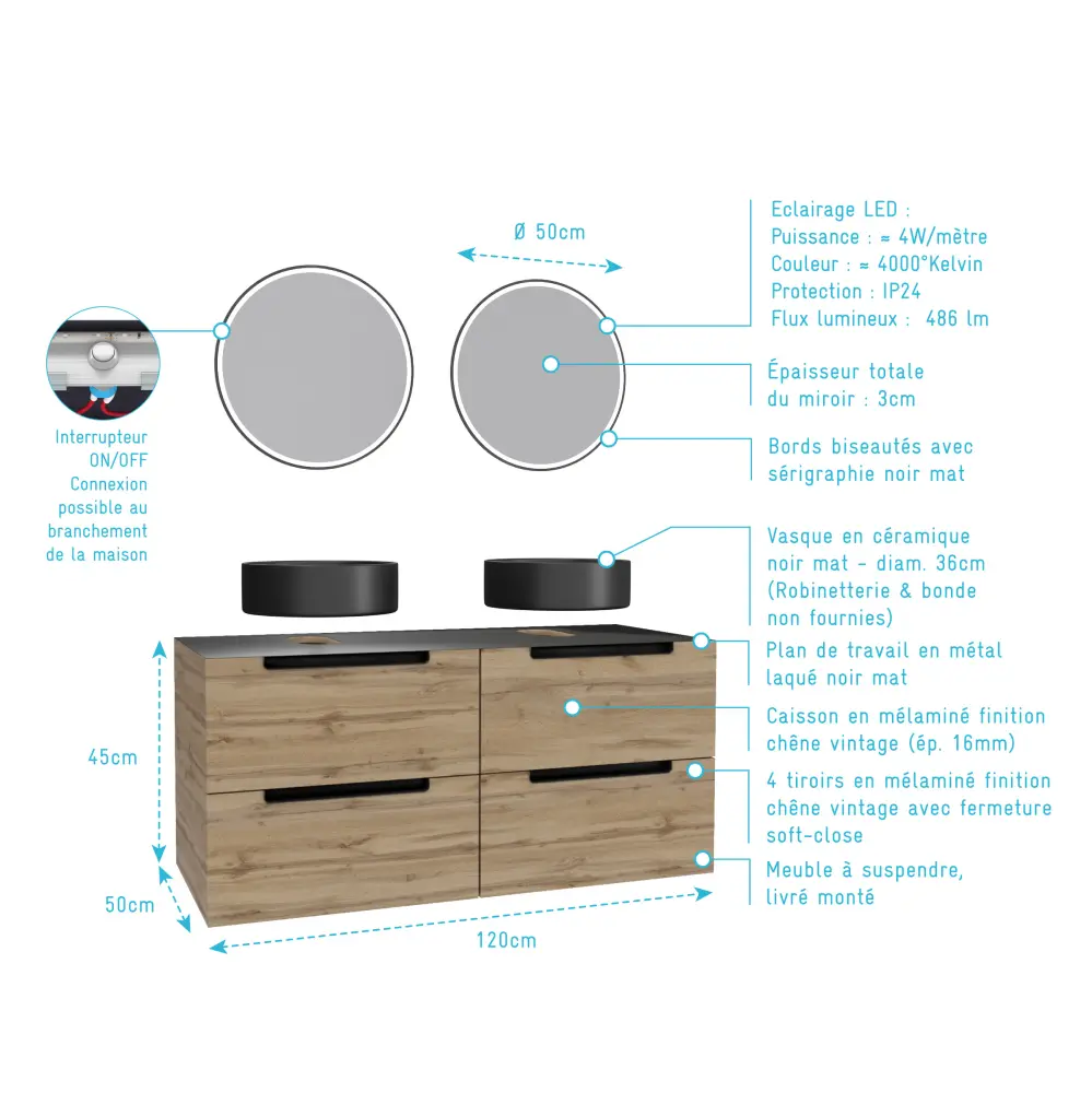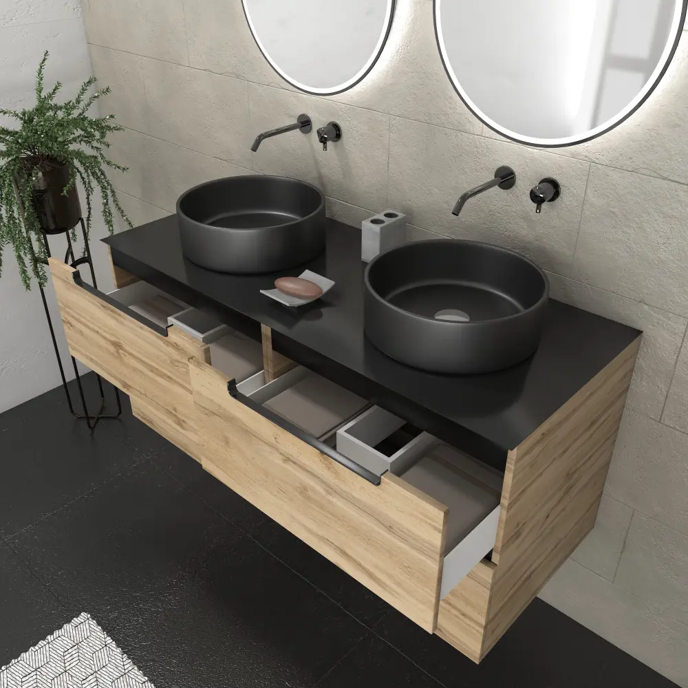 Este mueble se compone de 4 cajones con un acabado roble y una encimera de metal negro mate. El conjunto está equipado con 2 lavabos de cerámica negra y 2 espejos iluminados que aportarán carácter y un estilo industrial a su habitación.
