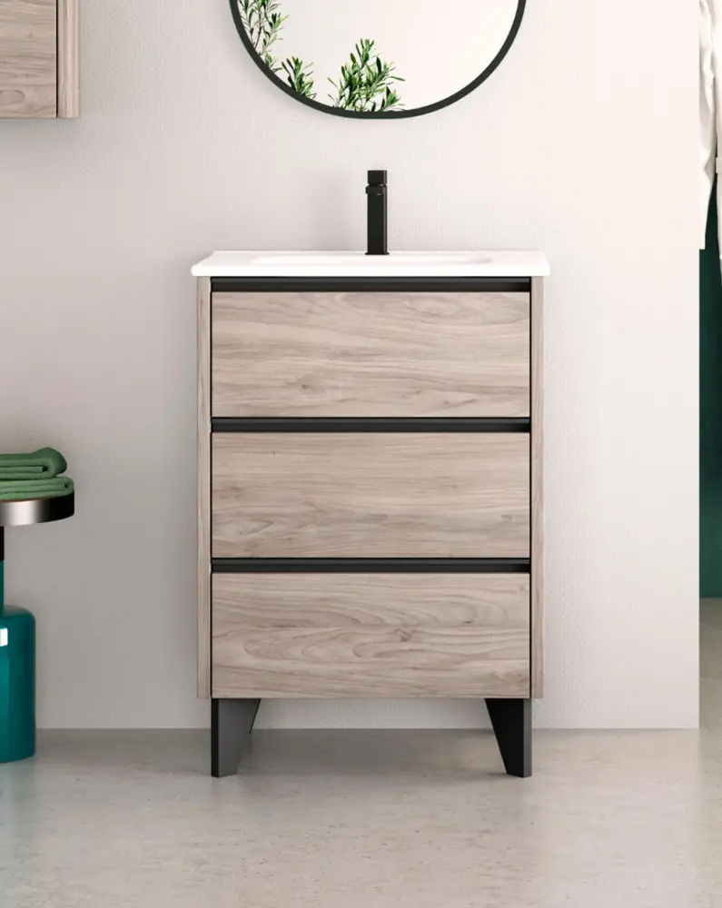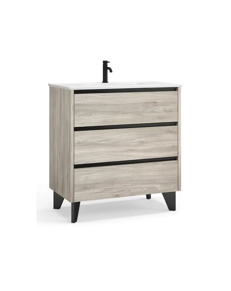 mueble de baño al suelo con 3 cajones. El cajón eminente cuenta con organizador y salvasifón. Reabastecido en ancho de 60cm, 70cm, 80cm y 100cm, en color blanco brillo, roble natural, pino gris, wengué nature y alpine, al igual que puede configurar el color de los tiradores y patas en cromo brillo y negro mate.