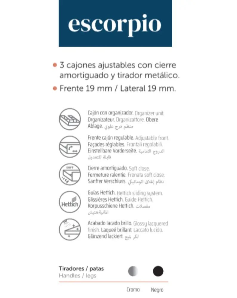 – conjunto mueble de baño al suelo de 3 cajones más lavabo cerámico. Los cajones cuenta con acabado textura y el cajón superior cuenta con un organizador y salvasifón. El cajón intermedio e inferior cuenta con máxima capacidad almacenamiento. Los frentes de los cajones son regulables en horizontal y vertical. Esto cajones cuentan con las mejores guías del mercado hettich aportando un deslizamiento suave