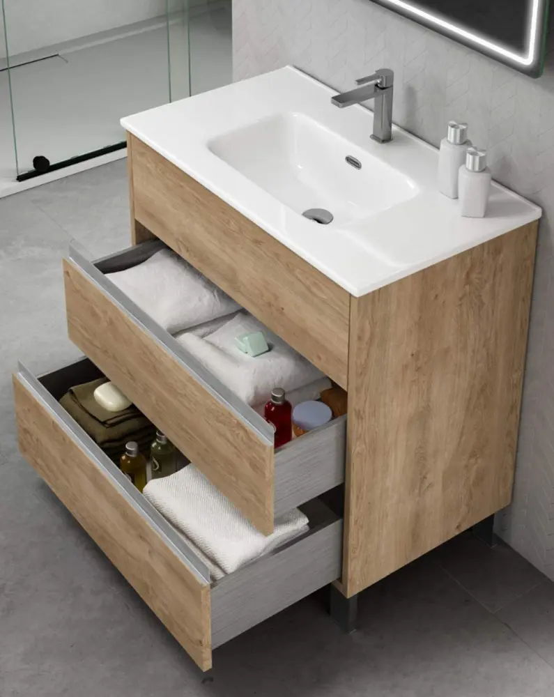 Mueble de baño al suelo con 3 cajones. El cajón superior cuenta con organizador y salvasifón. Reabastecido en ancho de 60cm, 70cm, 80cm y 100cm, en color blanco brillo, roble natural, pino gris, wengué nature y alpine, al igual que puede personalizar el color de los tiradores y patas en cromo brillo y negro mate.