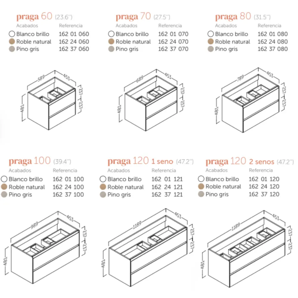 Mueble de baño volado al aire con 2 cajones con uñero. El cajón superior cuenta con organizador y salvasifón. Reabastecido en varias medidas: 60cm – 70cm – 80cm -100cm – 120cm(1 seno) -120cm (2 senos) y en color blanco brillo, roble natural y pino gris con uñeros. El mueble de baño viene acompañado de un lavabo cerámico. En todas las medidas en mueble de baño suspendido viene acompañado de un lavabo cerámico de 1 seno centrado, y en la medida de 120cm puede seleccionar el mueble con lavabo cerámico de 1 seno centrado o de 2 senos. Los cajones son regulables y con cierre amortiguado. Mueble de baño moderno, de grandes calidades a un precio muy competitivo.