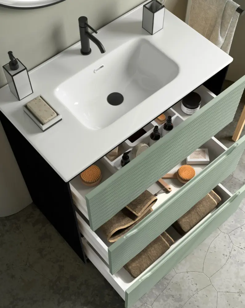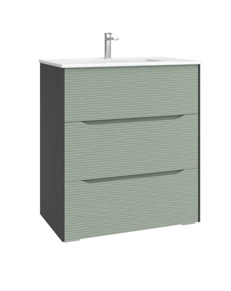 ✅ Conjunto Mueble de Baño a suelo modelo Nubia compuesto de 3 Cajones más Lavabo Cerámico. Frente de mueble de baño con textura Dune relieve y Cajones con uñero. El mueble de baño está compuesto por DM 19mm en terminación lacado UV en el frontal y en los laterales DM 19mm lacado en color negro y DM en melamina en roble auténtico. Decoración de baño de ALTA CALIDAD FABRICADOS en ESPAÑA. Producto Certificado por la PEFC (Asociación Española para la Sostenibilidad Forestal).