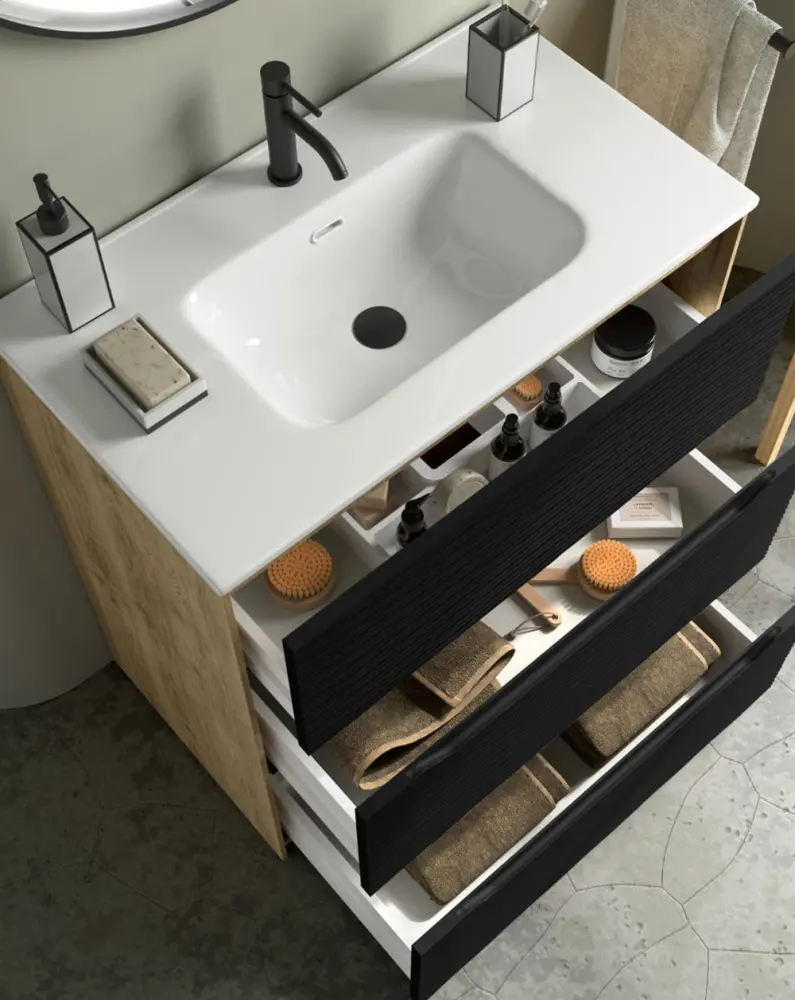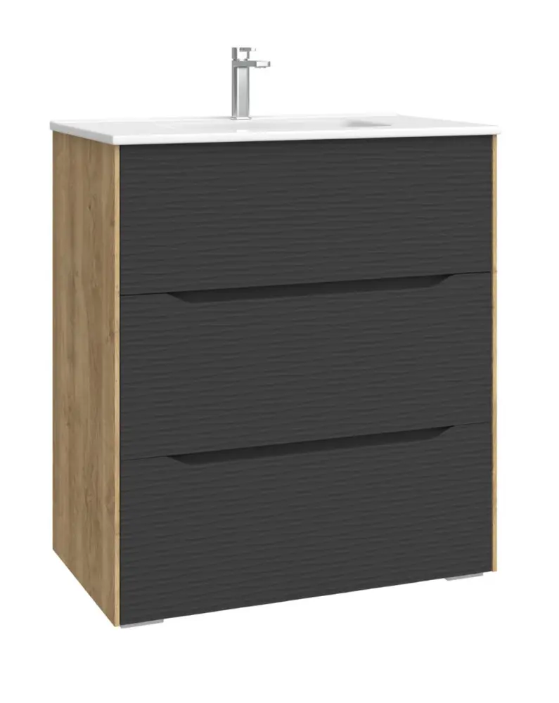 ✅ Conjunto Mueble de Baño a suelo modelo Nubia compuesto de 3 Cajones más Lavabo Cerámico. Frente de mueble de baño con textura Dune relieve y Cajones con uñero. El mueble de baño está compuesto por DM 19mm en terminación lacado UV en el frontal y en los laterales DM 19mm lacado en color negro y DM en melamina en roble genuino. Decoración de baño de ALTA CALIDAD FABRICADOS en ESPAÑA. Producto Certificado por la PEFC (Asociación Española para la Sostenibilidad Forestal).