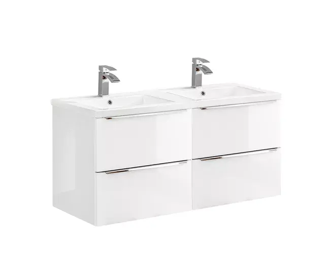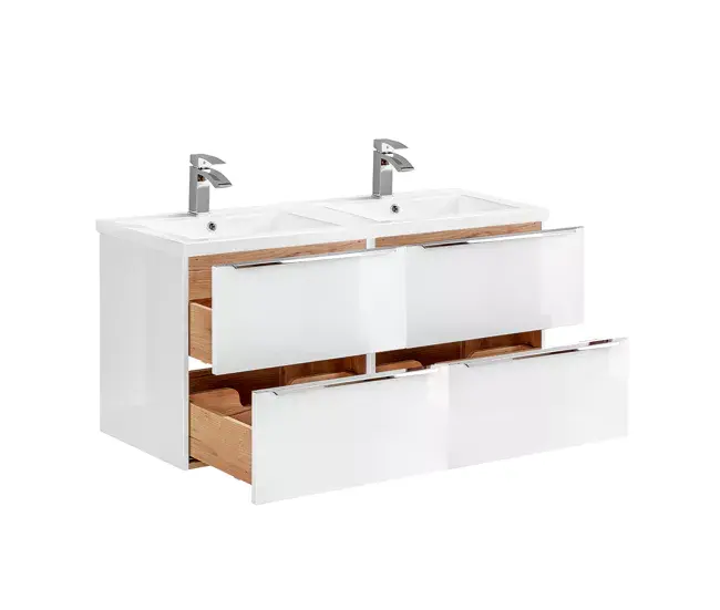 Características: Mueble suspendido – 4 cajones – Sistema de cierre silencioso – 1 lavabo doble encastrable Incluido – Fijaciones a pared: tornillos y tacos Incluidos – No obstante, se recomienda adaptar las fijaciones a la superficie – Este mueble está disponible en 3 medidas: 60 cm, 80 cm y 120 cm – Este mueble está disponible en 2 colores: Madera estilo roble y blanco lacado