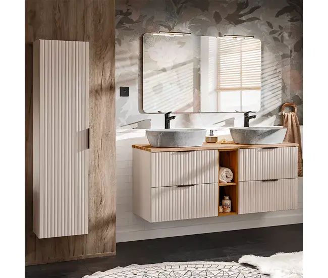 Mueble doble lavabo imitación piedra 140cm 2 compartimientos Adriel Cachemira y Madera