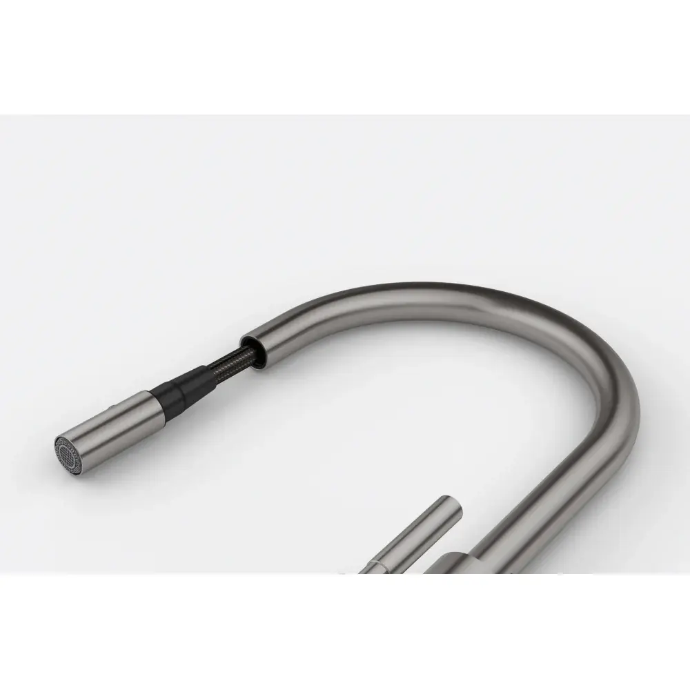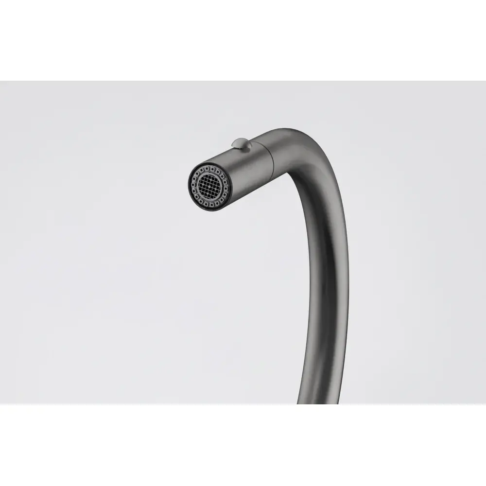 El grifo Mythos Masterpiece presenta un elegante patrón estirado en cuerpo del grifo con un diseño J con caño extraíble. Grifo con una funcionalidad sin límite. La maniobrabilidad del caño es fundamental para abarcar el mayor espacio de trabajo posible.