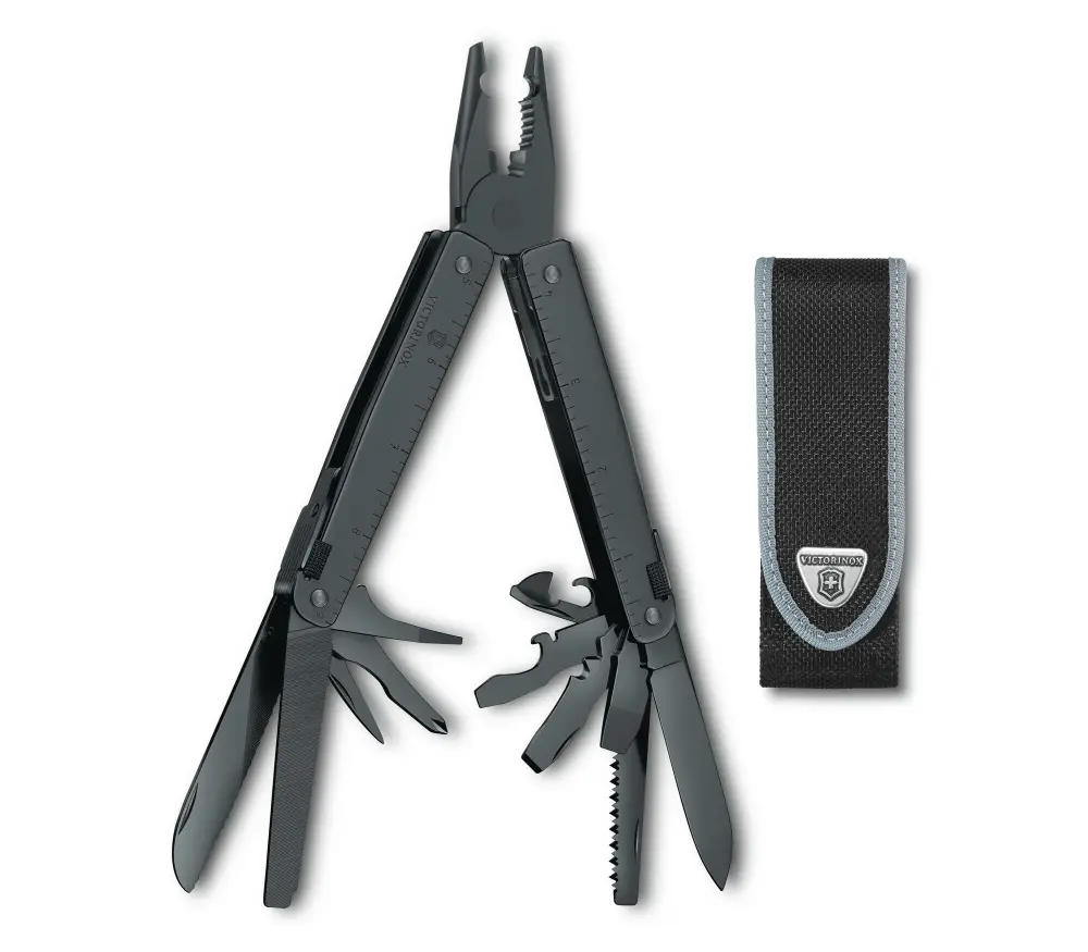 Esta personificación de una multiherramienta, que viene con un estuche duradero, cuenta con una superficie de acero pulido negro que le otorga un acabado ennegrecido elegante y una destacado protección contra la corrosión.