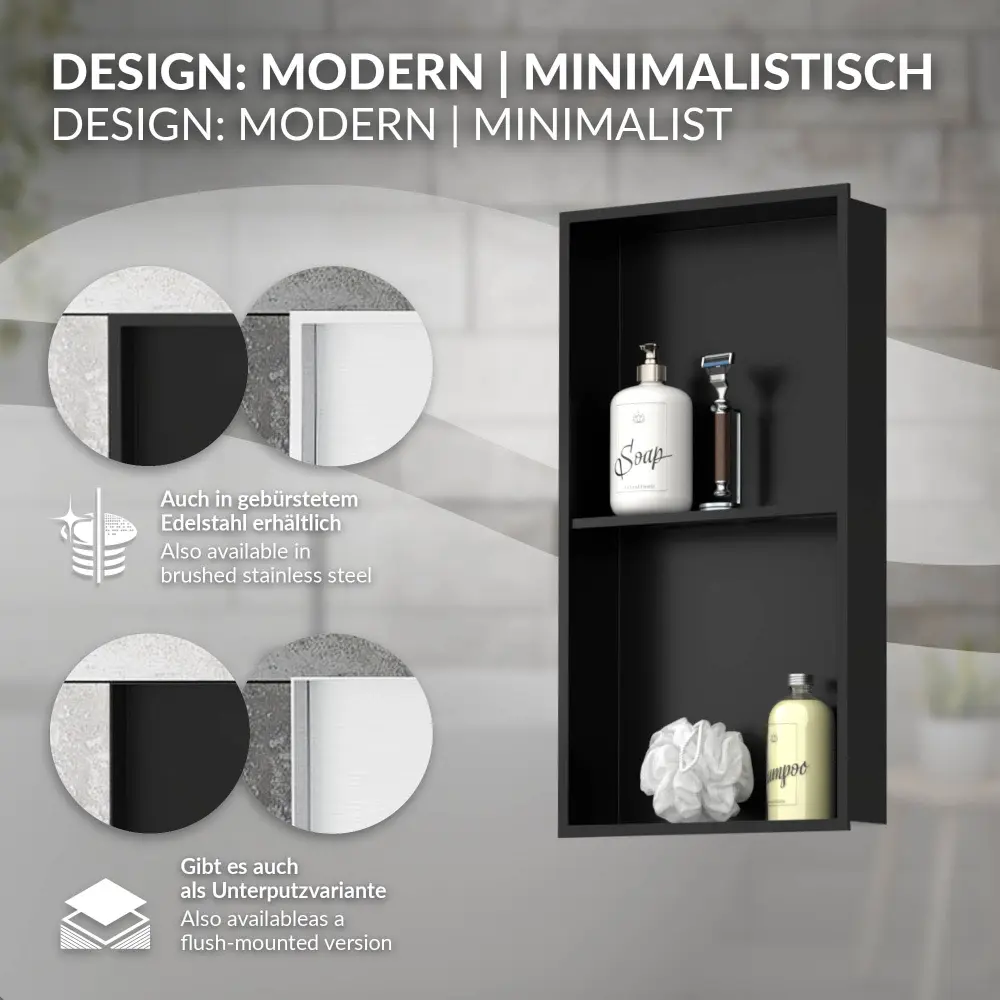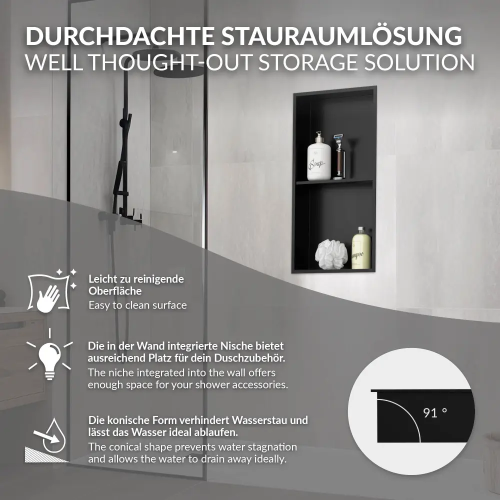 Nuestra hornacina de ducha establece nuevos estándares en términos de funcionalidad y diseño. Con dos niveles de 295 mm de altura cada uno, dispondrá de mucho espacio para guardar champú, jabón y otros utensilios de ducha. La generosa anchura de 300 mm le permite preparar cómodamente sus productos de cuidado. Gracias al ángulo de 91°, la hornacina se ha fabricado de forma que quede sujeta a la pared de forma segura y estable, sin caerse.