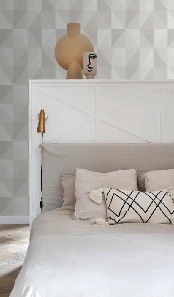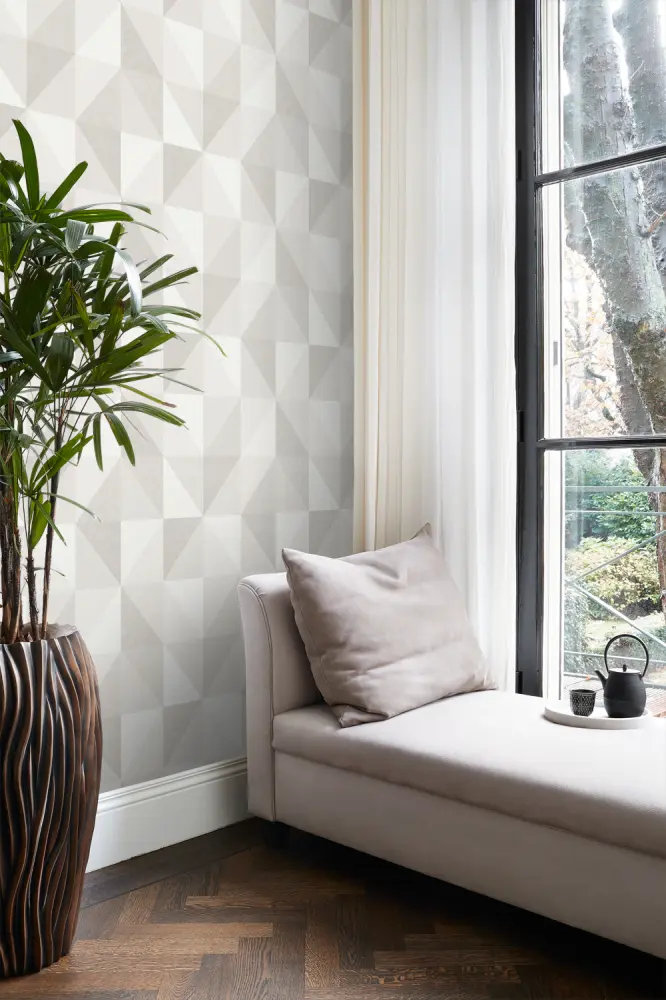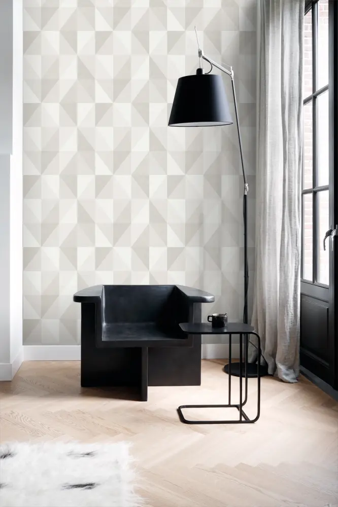 Este papel pintado elegante con 3D gráfico en beige claro es un legítimo atractivo y tiene un bonito aspecto mate. Este papel pintado va bien perfectamente en un interior moderno. Los colores básicos de un interior moderno consisten principalmente en negro, gris o marrón y blanco, pero para un bonito efecto de contraste se puede combinar maravillosamente con un color llamativo