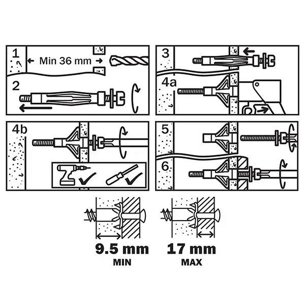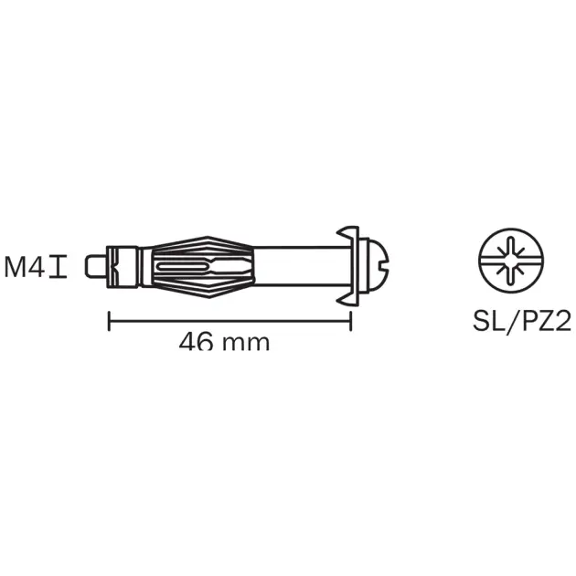 Tipo de producto: Anclaje arpa.Medidas: Longitud 46 x;Ø 8 mm.Tamaño del perno: 4 mm.Tela: Acero.Tamaño del orificio: 8 mm.Volumen máxima de fijación:17 mm.Cabeza de tornillo;Pozidriv número 2.Carga máxima: 12 kg.Cantidad: 4 unidades.Etiqueta: Diall.Uso: Panel de yeso. Tablero aglutinado y madera contrachapada. Aglomerado.