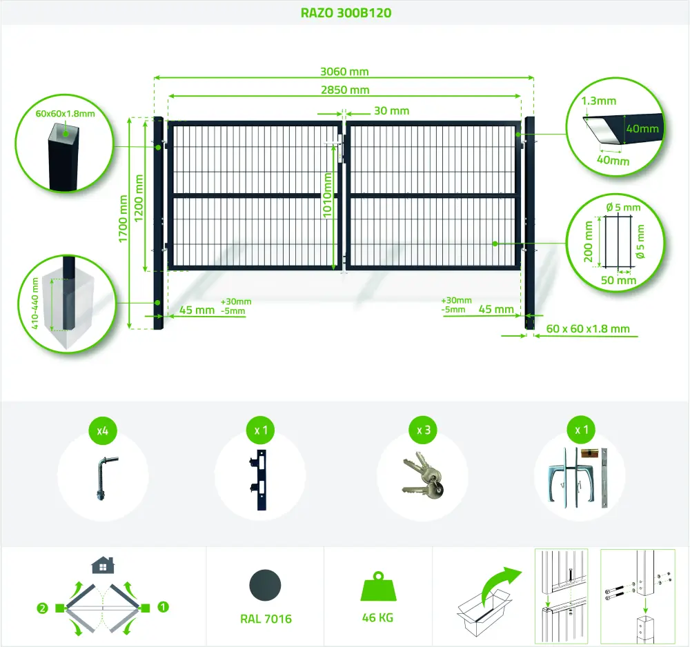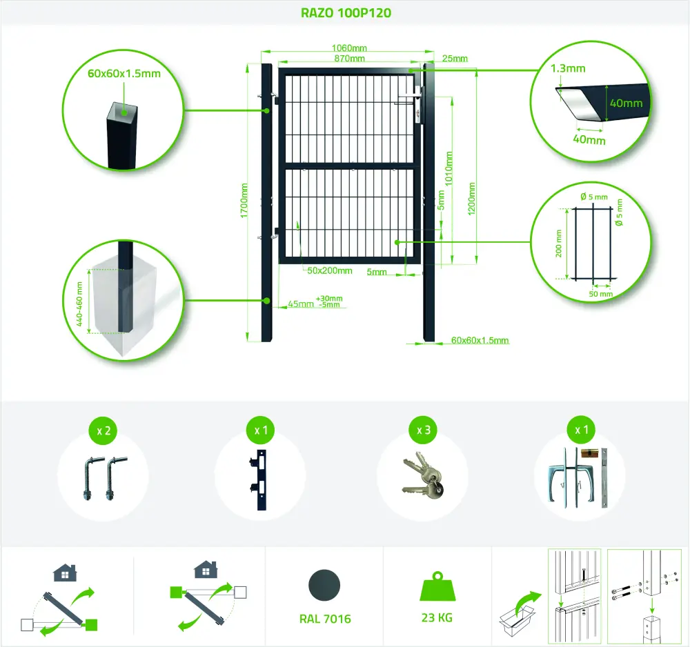 Puerta abatible de malla gris RAZO 3m